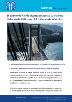 Usted está aquí: Inicio1 / Formulario2 / NP: El puente de Rande alcanza en agosto su máximo histórico de tráfico con 2,2 millones de vehículos3 / NP. Récord histórico de tráfico Autopista Atlántico. 21.09.19