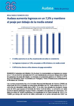 Usted está aquí: Inicio1 / Formulario2 / NP: Audasa aumenta ingresos nun 7,5% e mantén a peaxe por debaixo da media estatal3 / NP Resultados 1S Audasa. 23.09.19