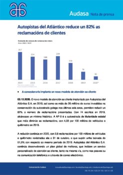 Usted está aquí: Inicio1 / Formulario2 / NP: Autopistas del Atlántico reduce un 82% las reclamaciones de clientes3 / Autopistas del Atlántico reduce un 82% as reclamacións dos clientes_NP...